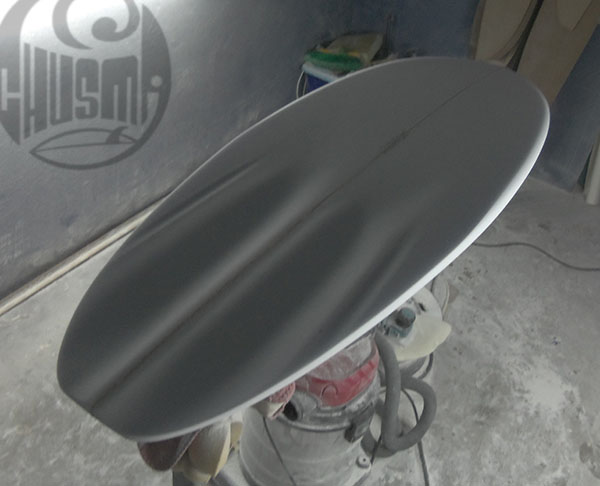 El laminado es todo en 4 oz en busca de ligereza, aunque manteniendo los parches habituales, la resina tintada en azul y el acabado wetsanded.