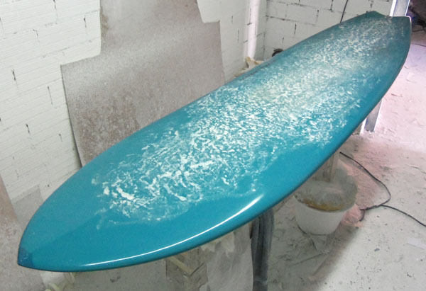 El laminado es en fibra de 6 oz con una mezcla de verdes en el bottom y 4+6 en el deck turquesa opaco, con puente de fibra para el invento y acabado pulido.
